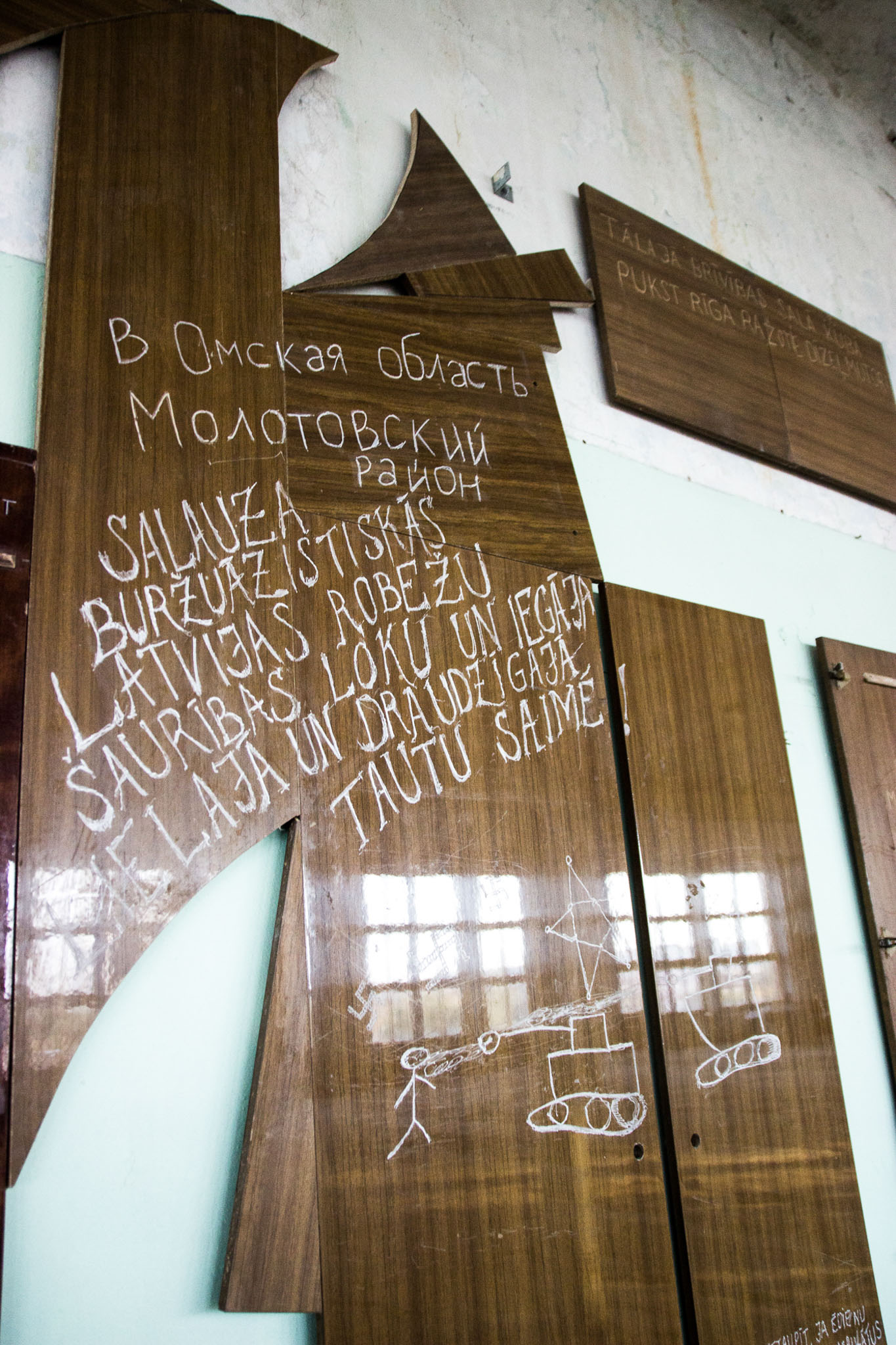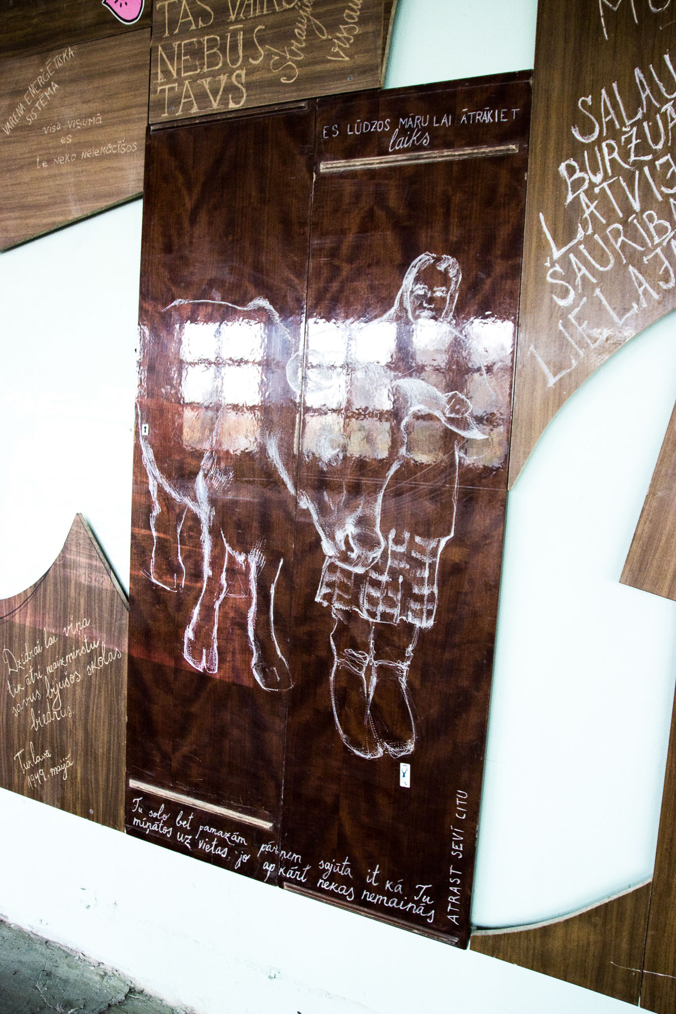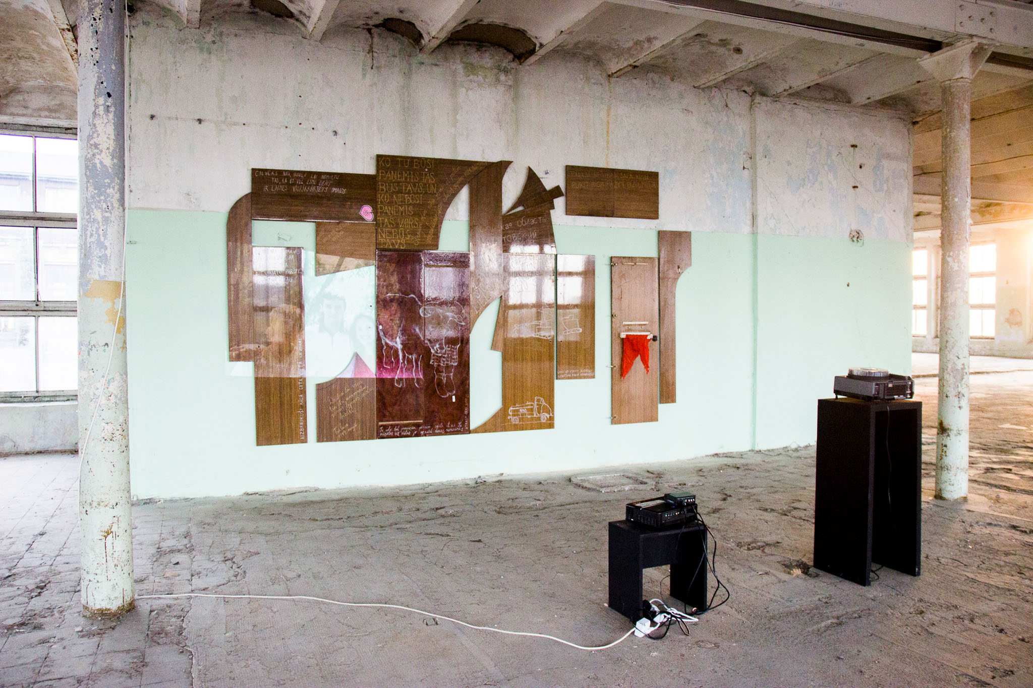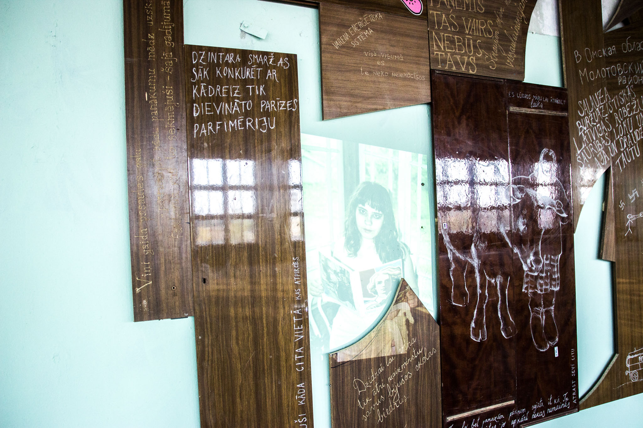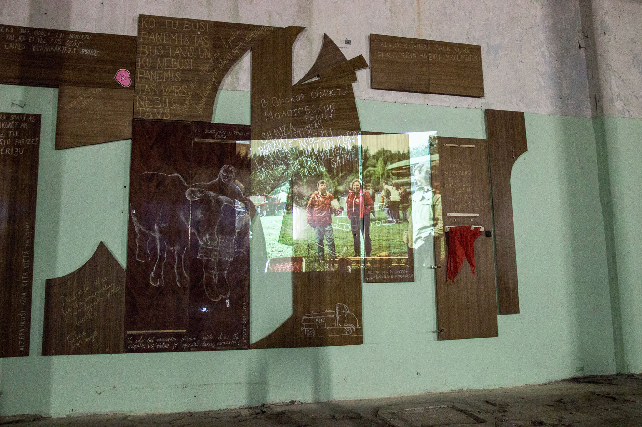 In 1984 my father was rejected from the Art Academy of Latvia, however later on while serving in the army he has to create the art and posters required for the system while working in the assembly hall of the military club. He hid his denim outfit behind embedded panels in the walls. The panel covers-up gaps and secrets. Behind it there is a forgotten, unrealized history. As a harmless, decorative layer the panels are meant to be a representation of status. Within them, we are able to rapidly approach the sunniest dreams of humanity where “Dzintars” competes with the ever so adored Parisian perfume! People’s lives, experiences and memories have also remained there for a lifetime. We understand that the continuity of it all is to be found in the present.