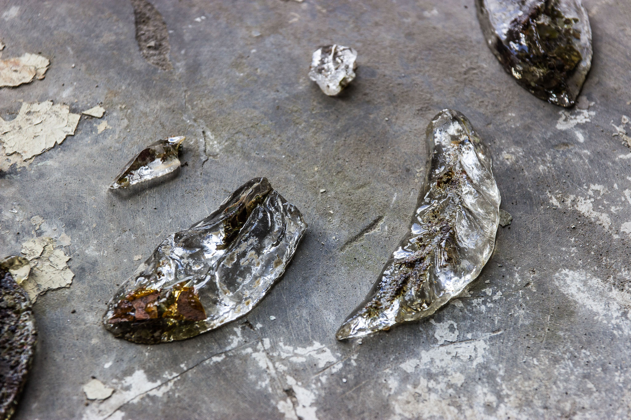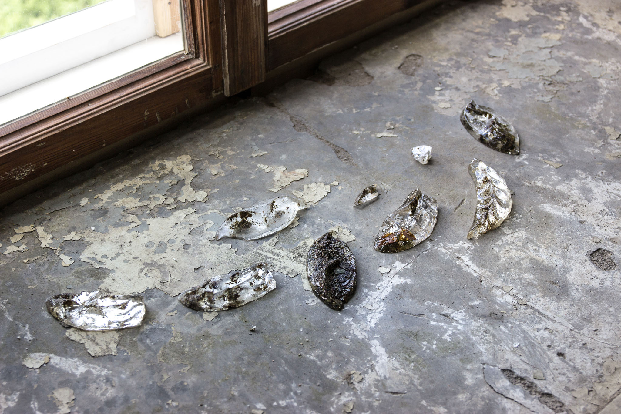 The fragile, semi-transparent but at the same time robust object, made from the polyester resin contains small pieces of dried paint, which were removed from the wall to reveal the previously coated decorative painting. The ornament is removed from the place where it could no longer express or show itself and begins an autonomous existence outside the wall, historical building or manor, movable wherever I want to place, where it takes shape and meaning.