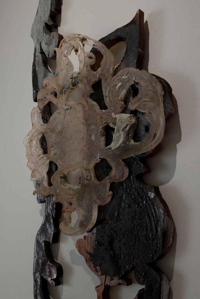 Mixed media installation: Video 6’20”, digital print, wood, acryl, epoxide, 2024